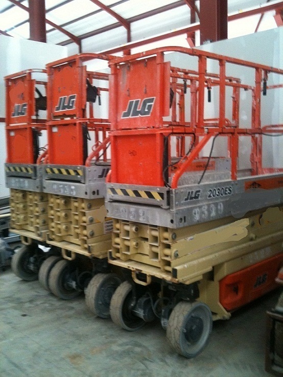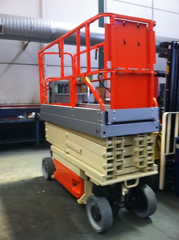 PLATAFORMA ELEVADORA DE TIJERA DE 10 METROS DE ALTURA DE TRABAJO, RUEDAS NO MARCANTES, ANCHURA TOTAL 0,76, CERTIFICADO CE, MAQUINA REVISADA, PINTADA Y EN PERFECTO ESTADO, VARIAS UNIDADES