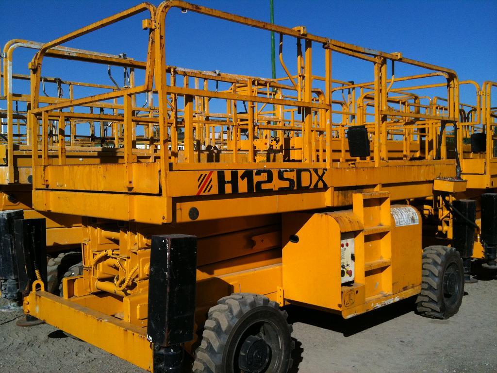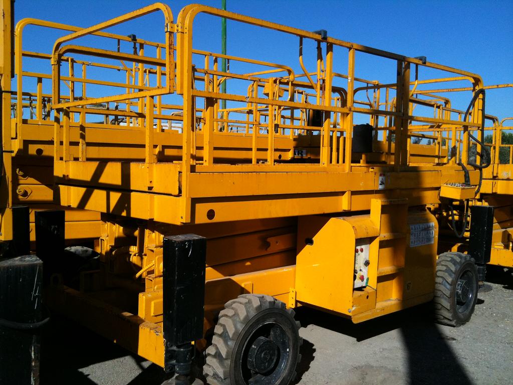PLATAFORMA ELEVADORA DE TIJERA DE 12 METROS DE ALTURA DE TRABAJO, 4 X 4, CON GATOS ESTABILIZADORES, DOBLE EXTENSION, BUEN ESTADO, POCAS HORAS, VARIAS UNIDADES